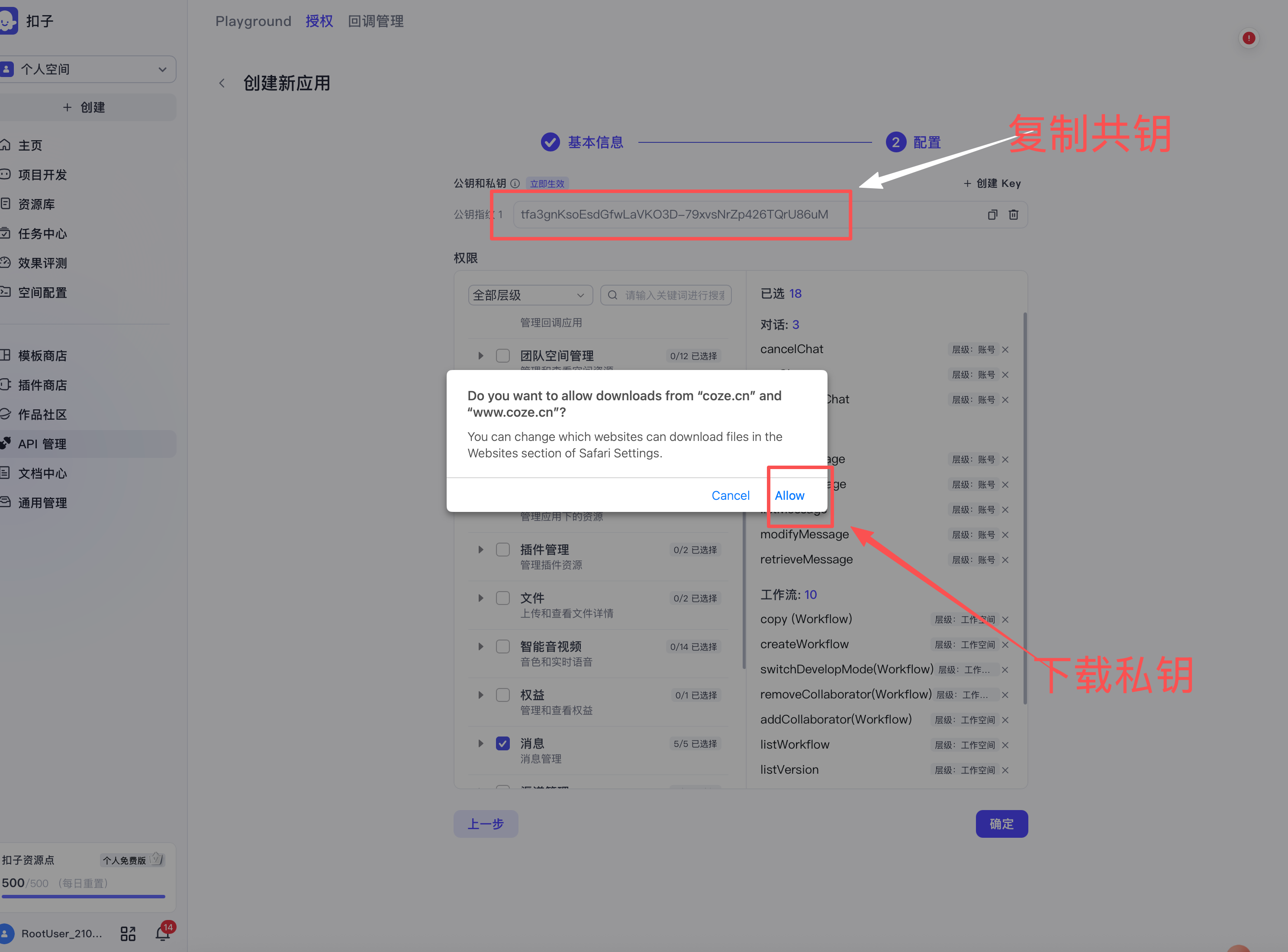 Enter the agent name and select the docking platform: coze, Fill in the parameters just obtained and save them.