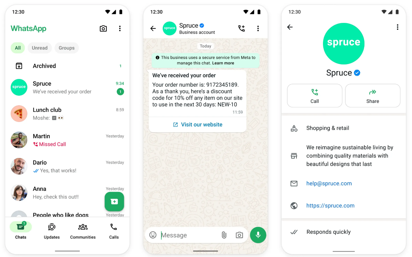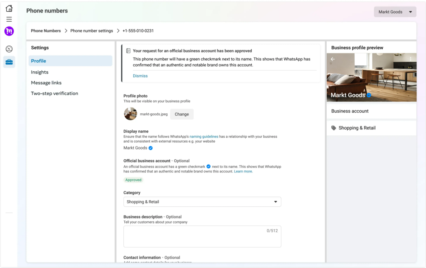 与此同时,这项决定并不限制您分享业务详情的能力。每个企业电话号码都对应一个企业简介,其中包括头像、邮箱、网站和企业描述。您可以随时编辑这些信息。