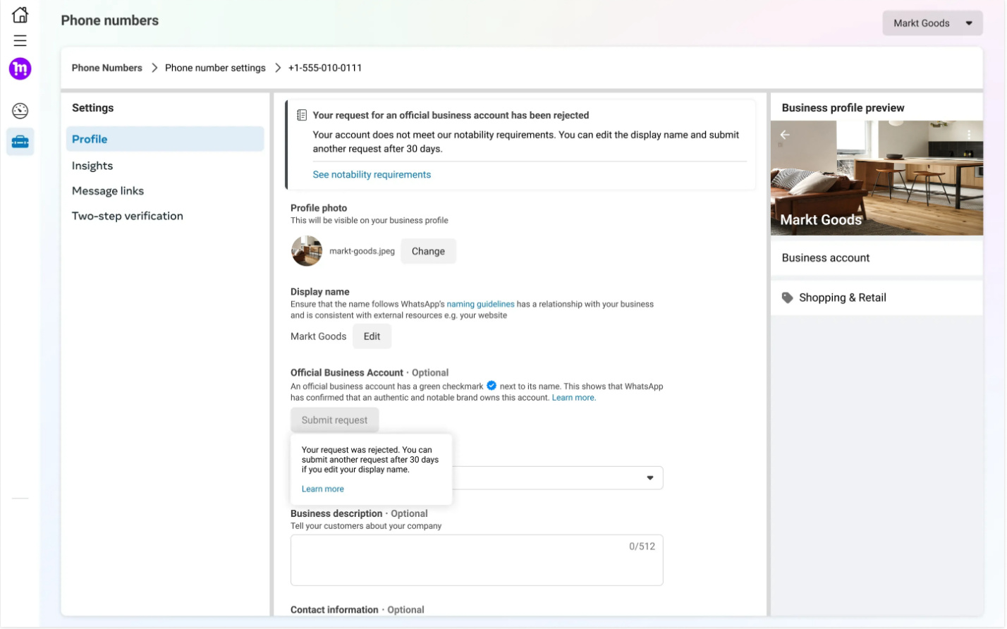 您可以使用 WhatsApp 管理器或 API 为企业电话号码申请 OBA 状态。我们审核您的申请后,会通知您企业电话号码是否已获得 OBA 号码状态。如果您的申请被拒绝,您可以 30 天后再次提交申请。