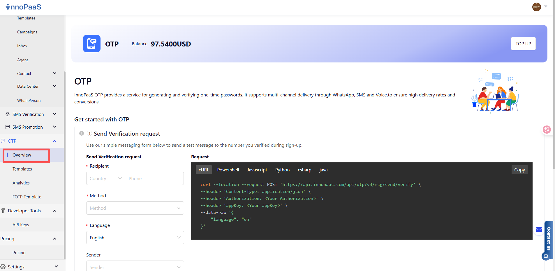 Click 【OTP-Overview】 to enter the test sending process. Step 1: Send Verification Request: Enter recipient information, select the sending method (SMS, WhatsApp), language, Sender, and the verification code you want to test and click Send.