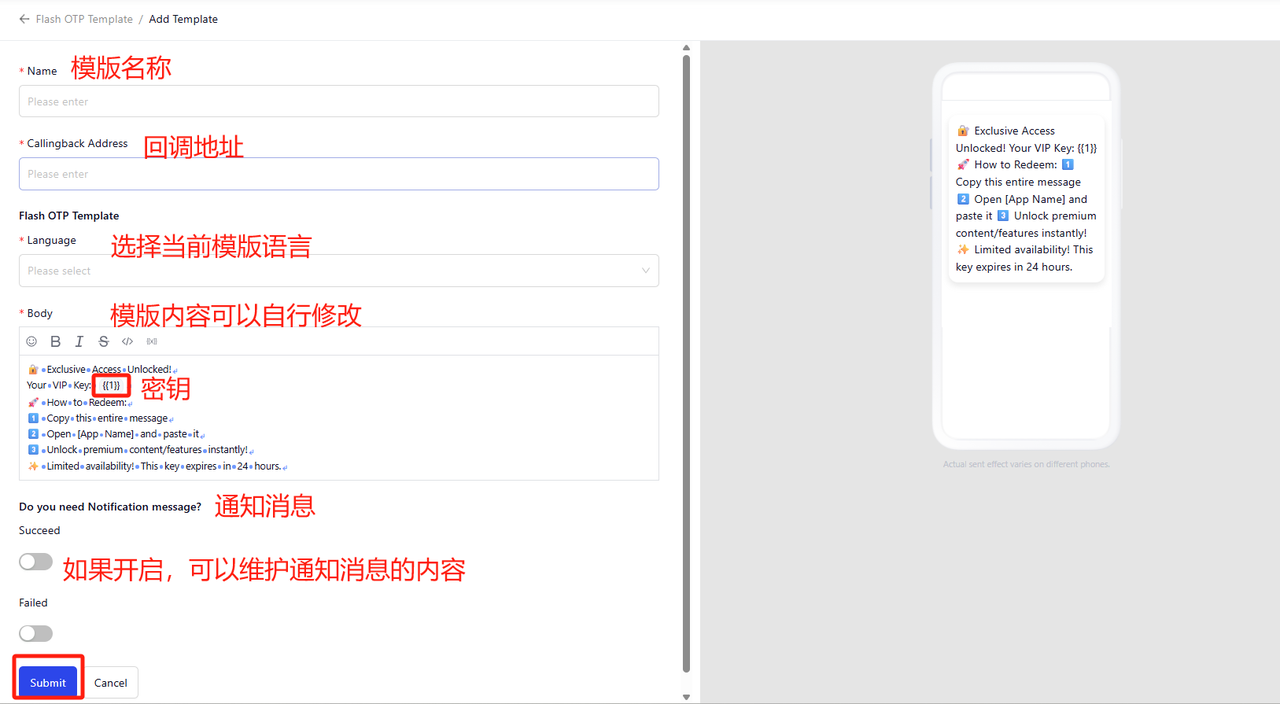 Fill in the template name and callback address (after the client sends content, we will push upstream information including text content and verification code to you).