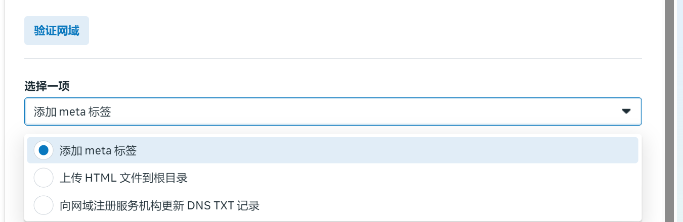把提供的 meta 标签代码复制粘贴到网站首页 HTML 代码中的<head> ... <head>部分,即可验证网域。