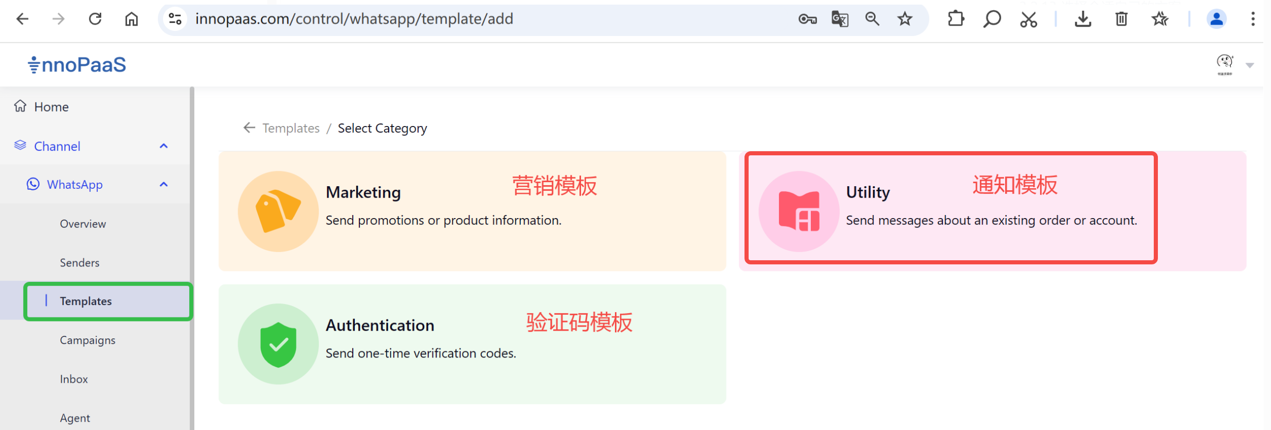 - 通知模板 Utility Send messages about an existing order or account.