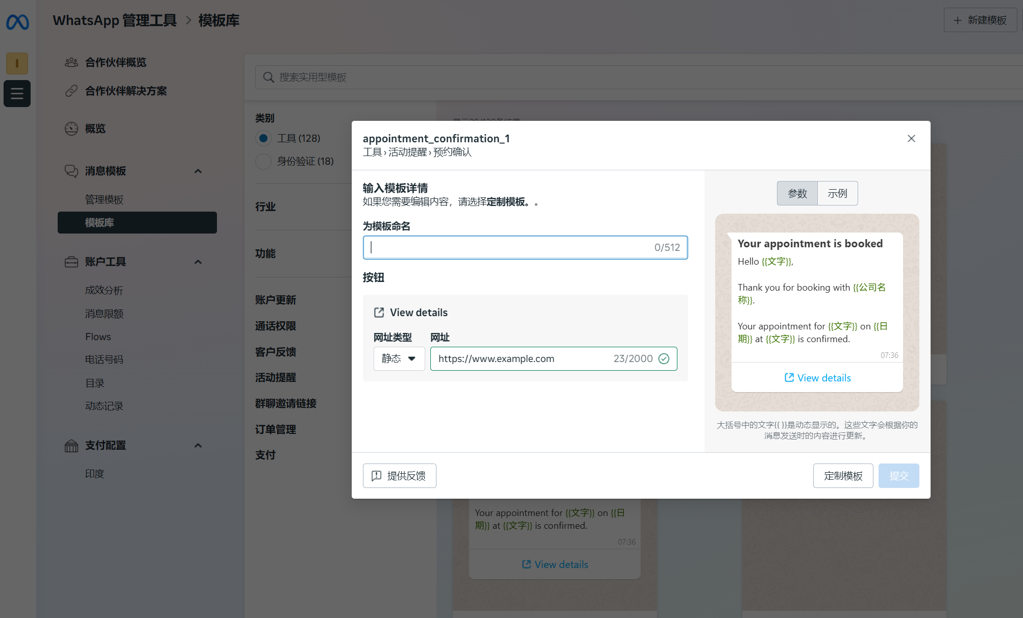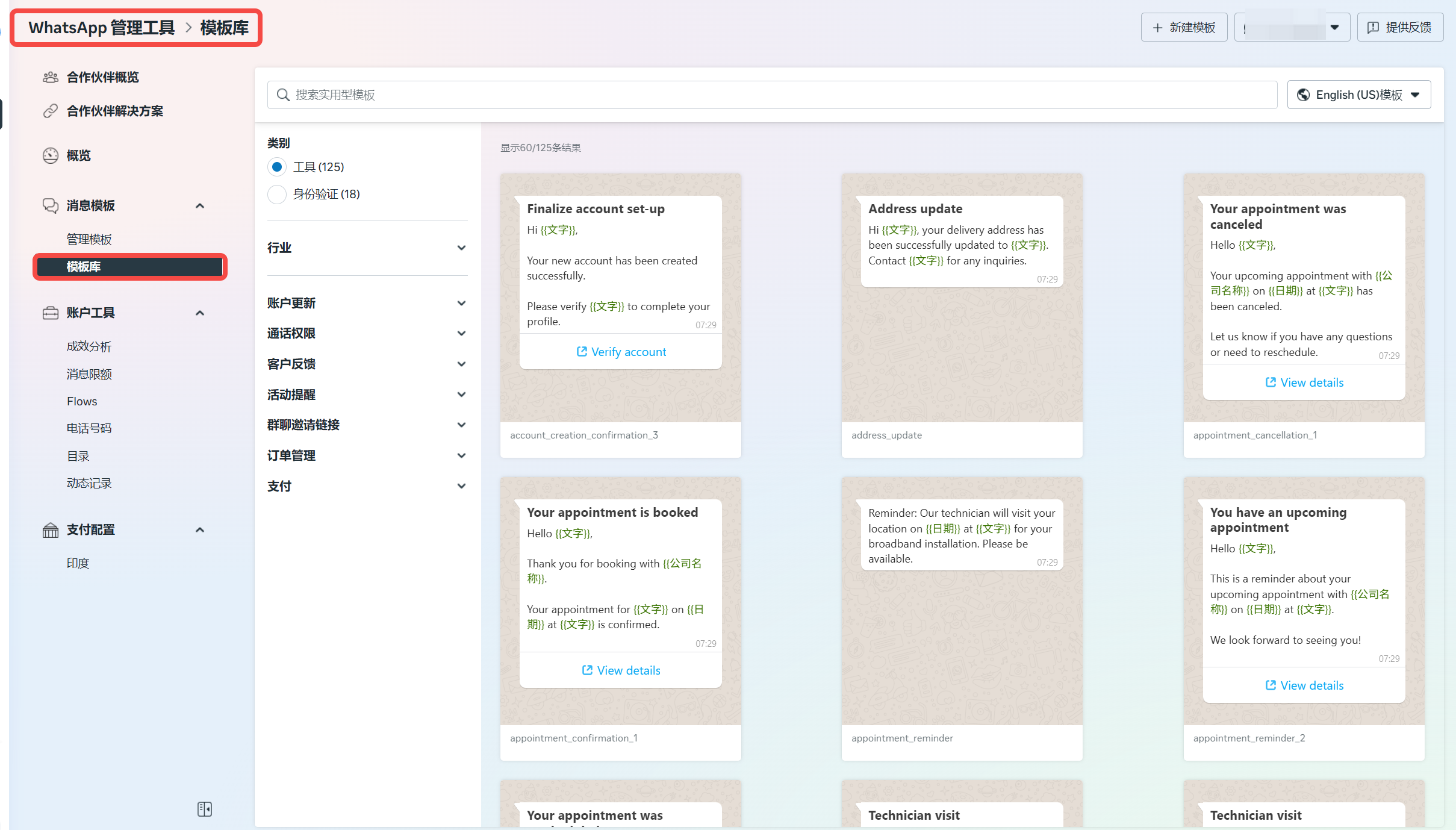 模板库使企业能够更快、更轻松地创建用于常见用例的实用模板,例如付款提醒、交货更新,以及用于常见身份验证用例的身份验证模板。