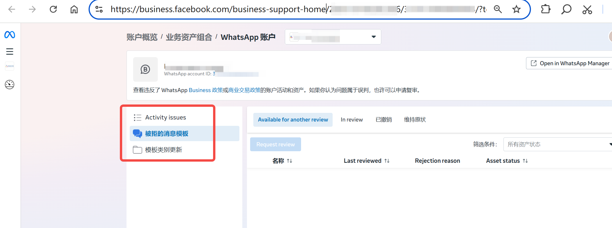 可查看违反了 WhatsApp Business 政策或商业交易政策的账户活动和资产。如果你认为问题属于误判,也许可以申请复审。