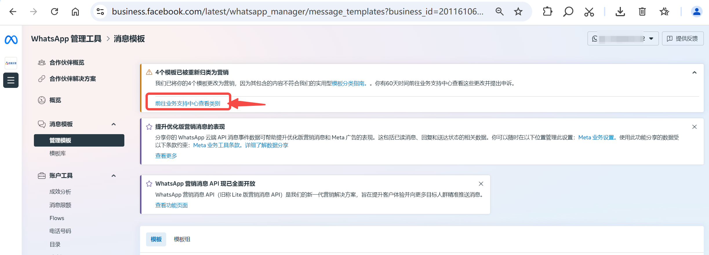 WhatsApp 管理工具的消息模板,点击"前往业务支持中心查看类别"跳转到WhatsApp 账户。